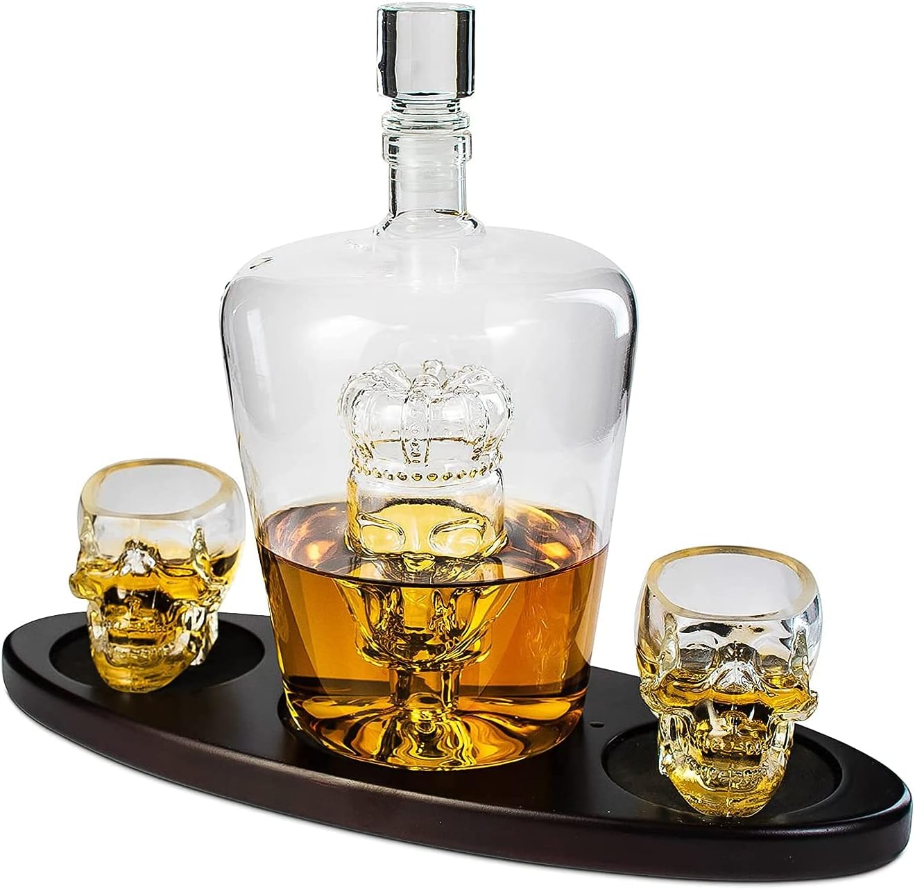 HIGHEST QUALITY: Complete with 1 skull-shaped decanter, 2-skull shaped shot glasses and a wooden tray holder. This set is perfect for Halloween, pirate-themed parties, or bachelor parties. Crafted of fine crystal for timeless shine and durability, guests won’t be able to resist talking about this set long after they’re done drinking. Great for vodka, liquor, whiskey, and more, this is one set that will make you stand out Handcrafted to add a unique design element to the home bar Crafted from solid glass, each liquor decanter contains an intriguing floating glass skull for an eerie feel.