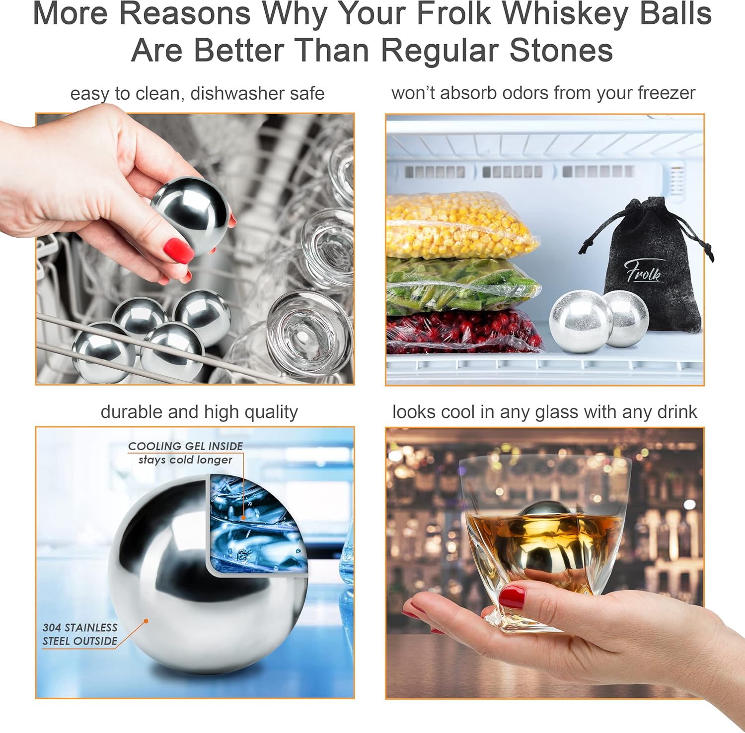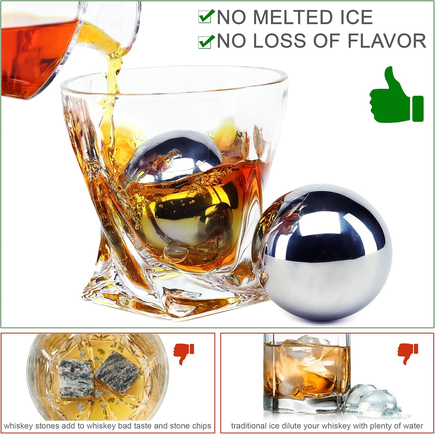 ✅ AN EXTRA LARGE WHISKEY STONES SET: No watered drinks – no dirty ice stones anymore! The EXTRA large 2.2″ (55mm) Stainless Steel whiskey rocks will chill your whiskey in no time, upgrading your whiskey enjoyment.